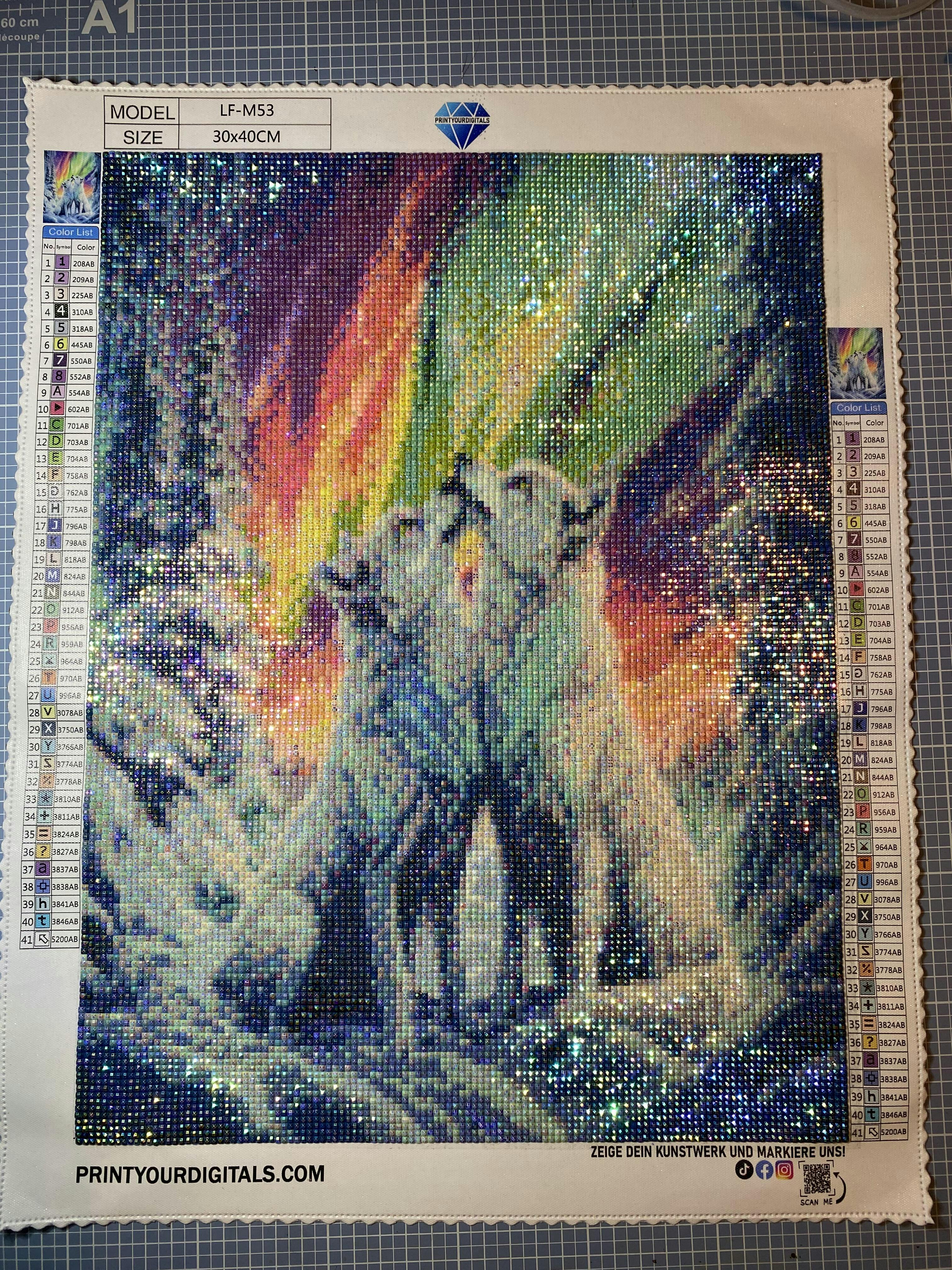 Das intensive Farbspiel der Aurora Borealis trifft auf feine Eis- und Fellstrukturen, die durch die FULL-AB-Veredelung besonders lebendig wirken. Jeder einzelne Stein reflektiert das Licht in schimmernden Nuancen, während Metallsteine gezielt Akzente setzen und dem Motiv eine hochwertige, edle Tiefe verleihen. Besonders das Polarlicht und die leuchtenden Details im Fell entfalten einen außergewöhnlichen Glanzeffekt.