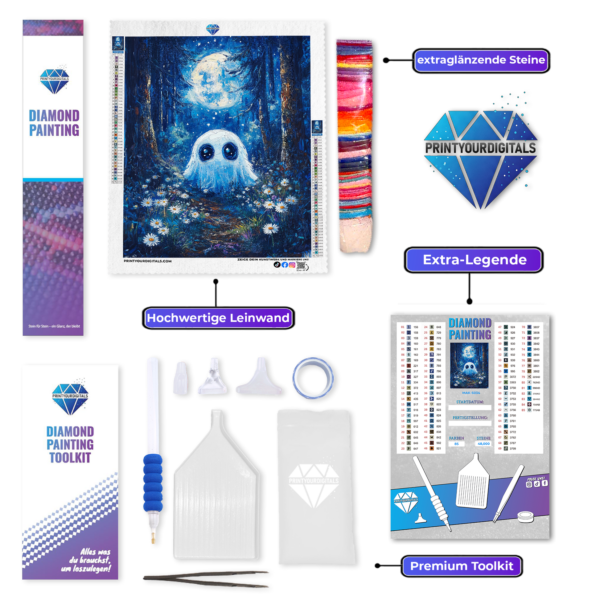 Mit deinem Diamond Painting erhältst du ein komplettes Set, sodass du direkt loslegen kannst:
