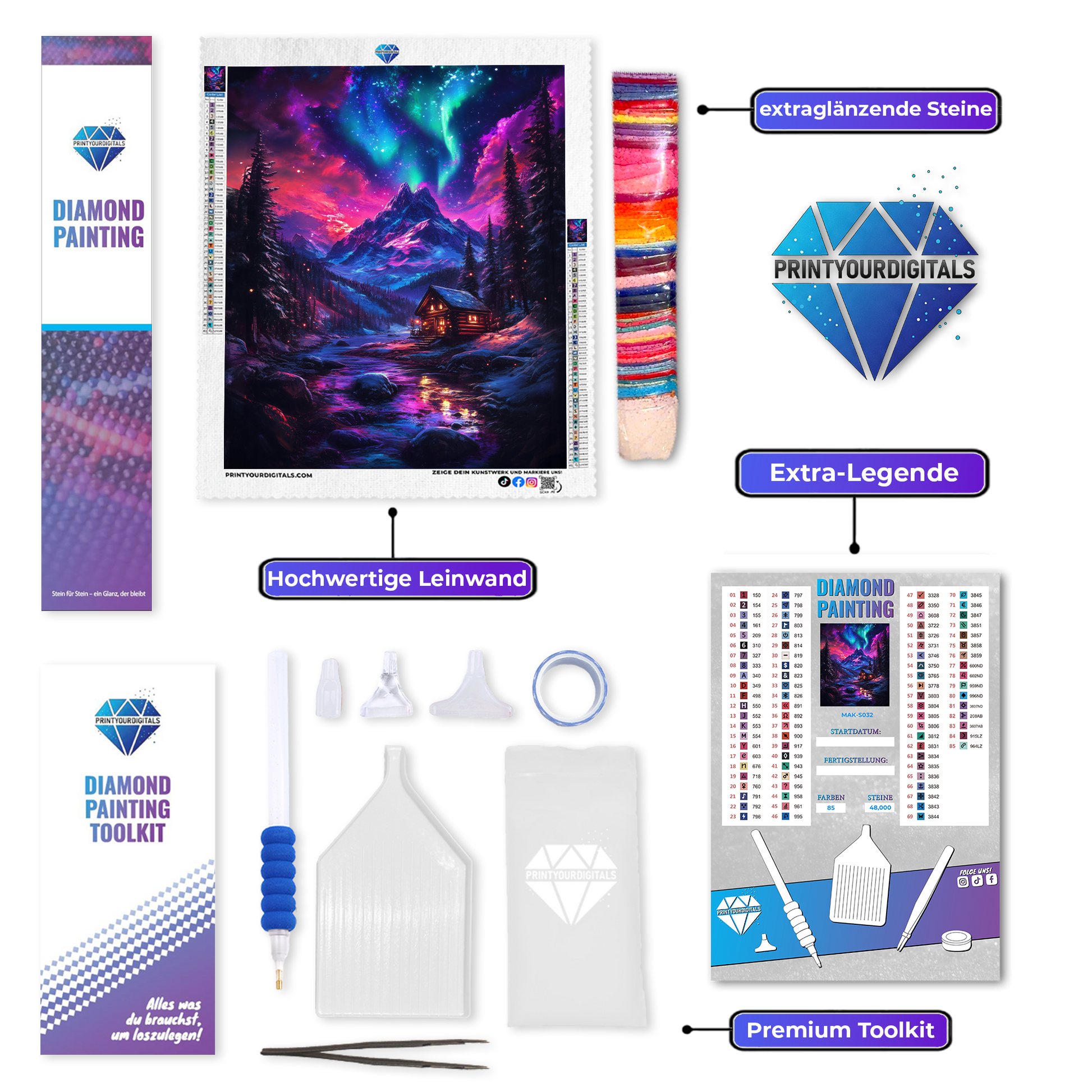 Mit deinem Diamond Painting erhältst du ein komplettes Set, sodass du direkt loslegen kannst: