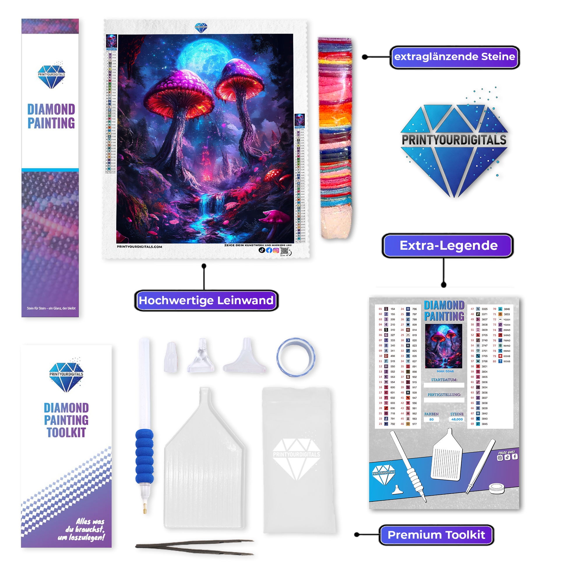 Dieses magisch-leuchtende Diamond Painting zeigt einen mystischen Wald mit gigantischen, neonstrahlenden Pilzen, die unter dem hellen Mondlicht erglühen. Das Farbspiel aus Violett, Blau und kräftigem Pink erzeugt eine einzigartige Fantasy-Atmosphäre voller Tiefe und Lichtenergie.