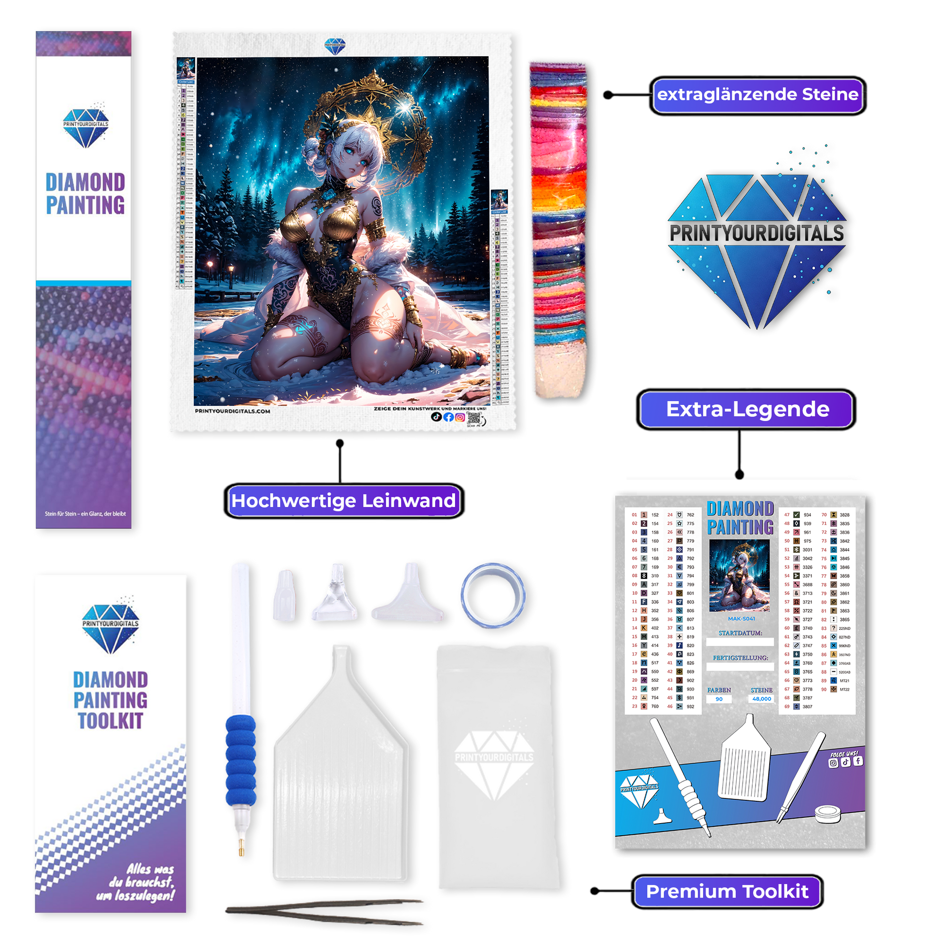 Mit deinem Diamond Painting erhältst du ein komplettes Set, sodass du direkt loslegen kannst: